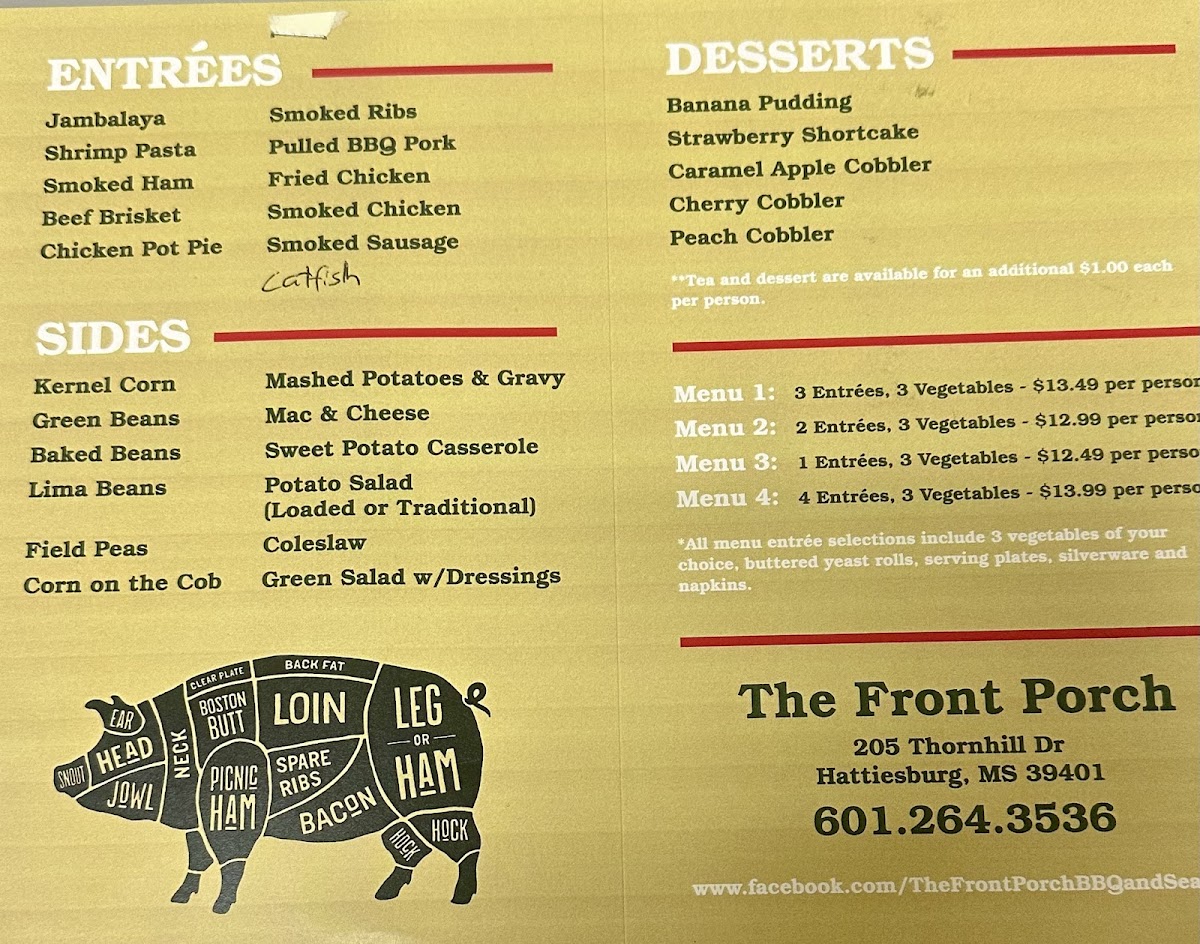 Welcome to The Front Porch BBQ & Seafood, a delightful buffet restaurant nestled in Hattiesburg, MS, where Southern hospitality meets culinary excellence. Our menu is a mouthwatering tapestry of flavors, featuring hearty entrées like smoked ribs, beef brisket, and Creole classics such as jambalaya and shrimp pasta. Each dish is crafted to evoke the warmth of home-cooked meals, ensuring that every bite is satisfying and full of flavor.